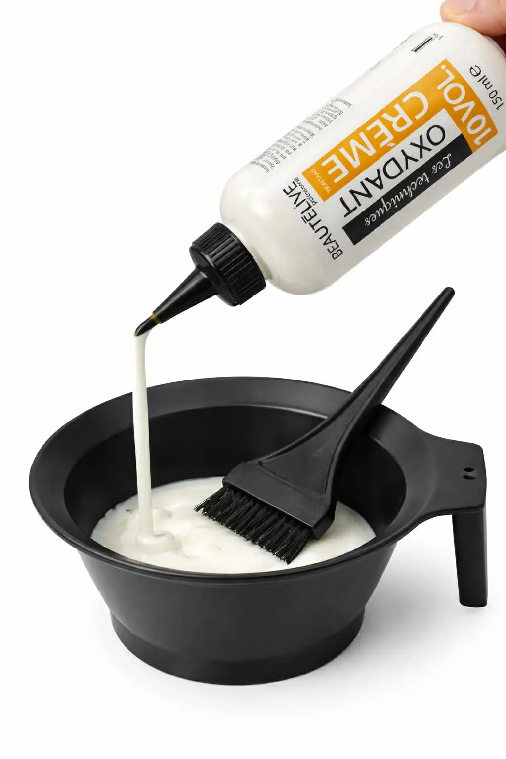 - Mélanger avec une crème colorante ou une poudre décolorante selon le ratio recommandé